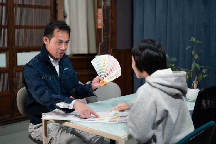 小さなカラーチップで選んだ色を大きな外壁に塗ると、印象が変わることがあります。「本当に気に入った色の家で過ごしてほしい」という想いから、カラースタイルでは試し塗りサービスをおこなっています。