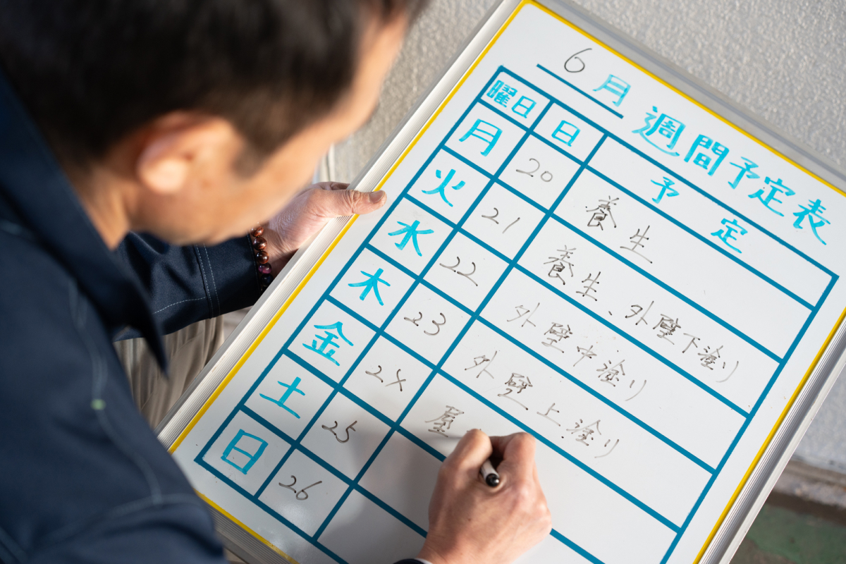 工事開始日の前日に、確認のご連絡をいたします。工事中はホワイトボードを設置し、1週間の工事内容を記載して進行いたします。各工程の施工写真を撮り、工事完了後にお客様へ提出いたします。
